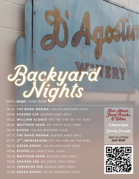 Backyard Nights at D'Agostini Wines are free, family friendly Friday evenings featuring live music, rotating food trucks, and wines served from our outdoor bar. Doors open at 5:30 PM and music runs from 6 to 9 PM. RSVP requested. Picnic table seating is available, but it is first come, first serve, so bringing a lawn chair or blanket never hurts. Pair it all with wines by the glass or bottle from our outdoor bar.